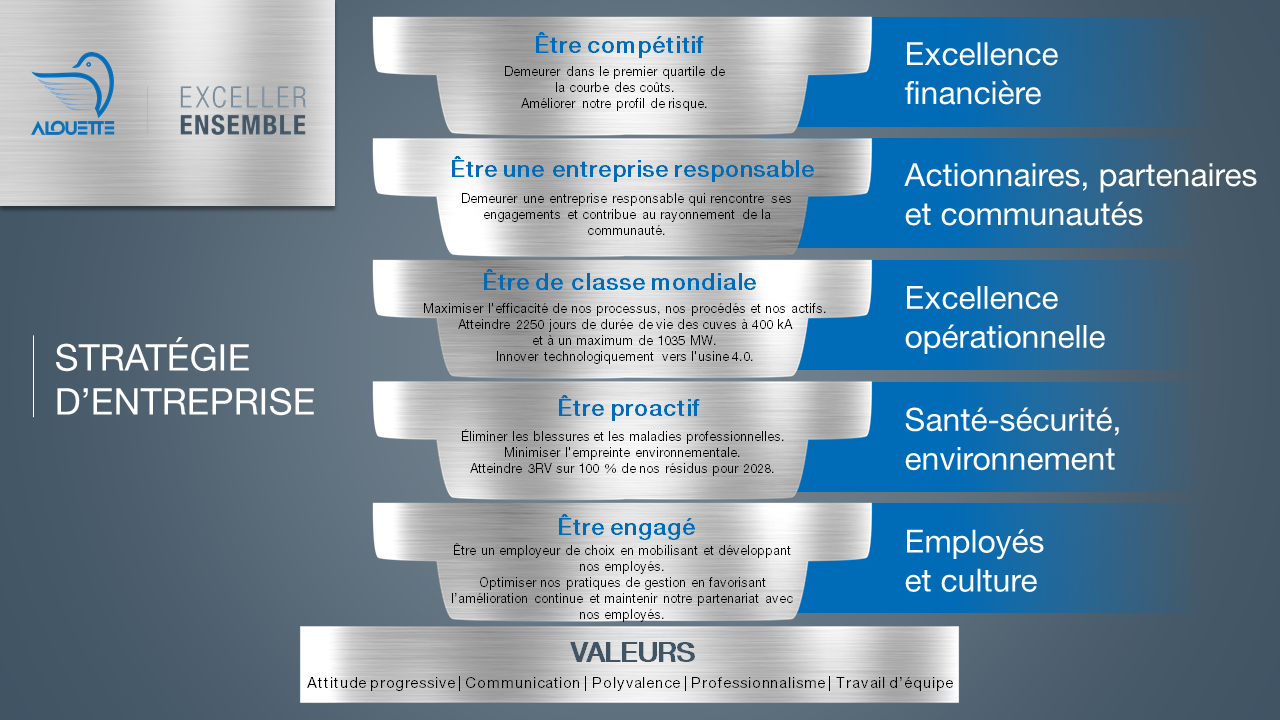 « Aluminerie Alouette, en tant qu’entreprise de production indépendante, optimisera son exploitation en utilisant des principes d’affaires de classe mondiale, visant l’amélioration continue de ses procédés et de ses actifs. Comme entreprise souscrivant au développement durable, Aluminerie Alouette maintiendra de hauts standards de santé, de sécurité et d’environnement de façon à être reconnue comme un employeur et un citoyen corporatif responsable. »